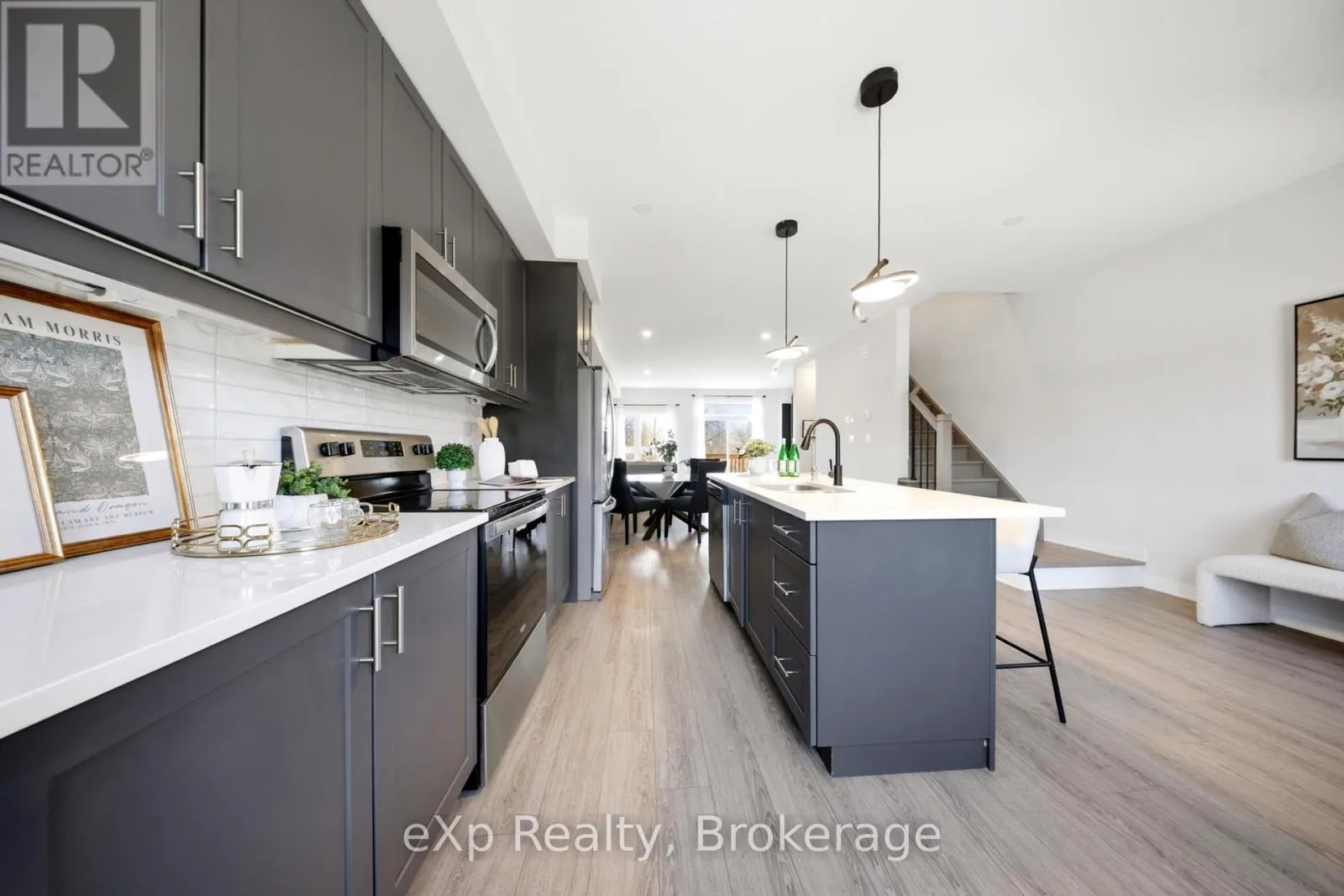 layout with the first of two primary bedrooms, full bath, and utility space-ideal for guests or a home office. Upstairs, enjoy a bright, open-concept living and dining area with 9-foot ceilings, perfect for entertaining, alongside a sleek modern kitchen complete with quartz countertops, stainless steel appliances, soft-close cabinetry, and a large island. Step out onto the expansive balcony for fresh air and outdoor enjoyment. The third level boasts a convenient laundry area, three generously sized bedrooms, a stylish main bath, and a serene primary retreat featuring a private 3-piece ensuite. Ideally situated close to shopping, dining, public transit, and major highways, this exceptional home offers the perfect blend of style, comfort, and convenience-an incredible opportunity not to be missed. (id:62650)