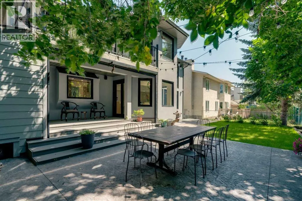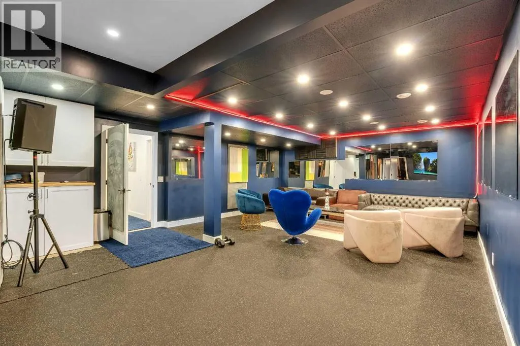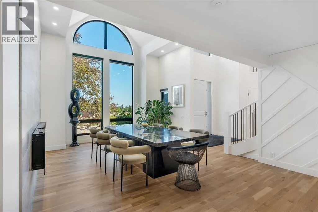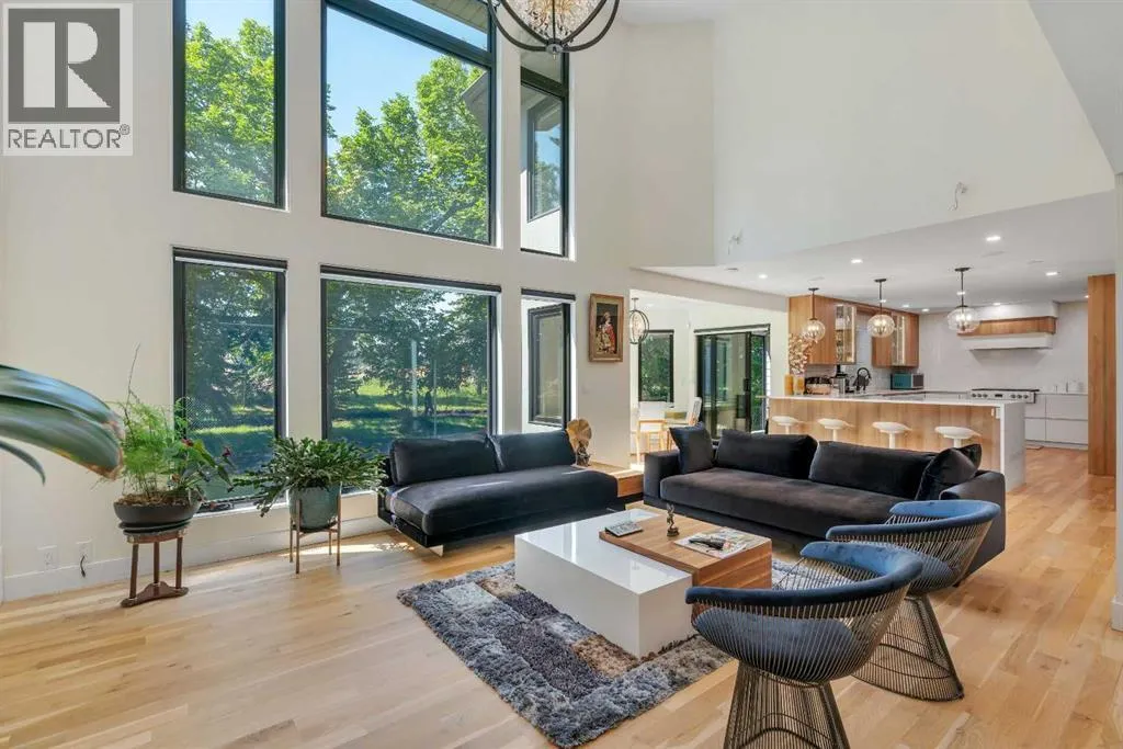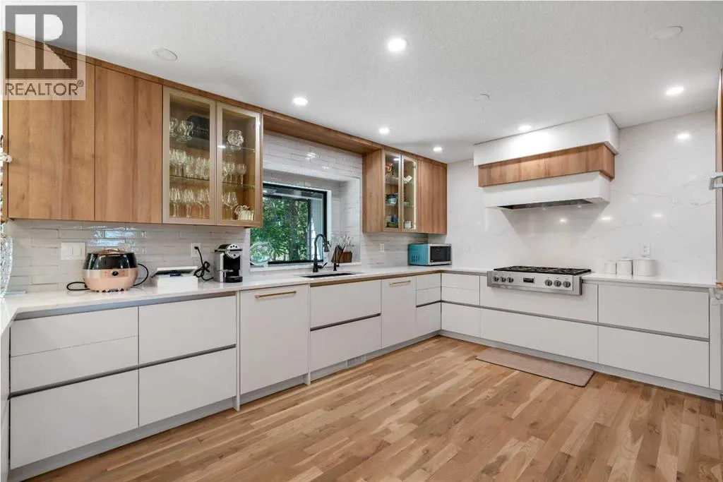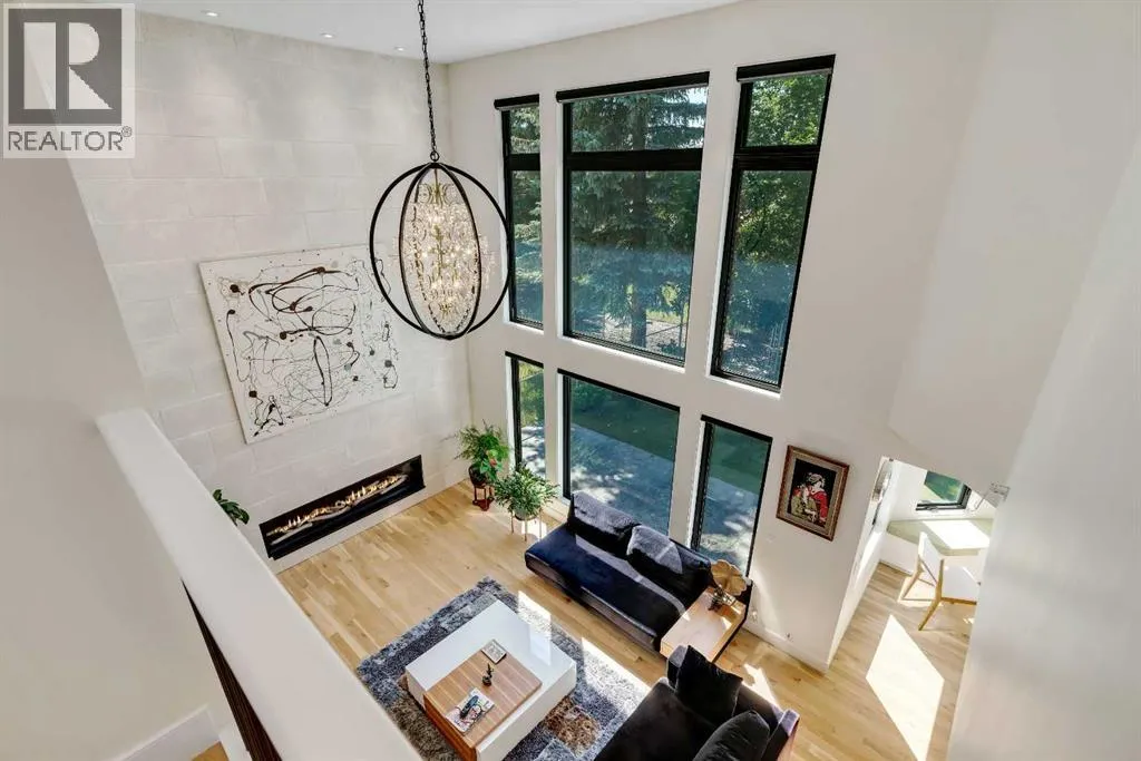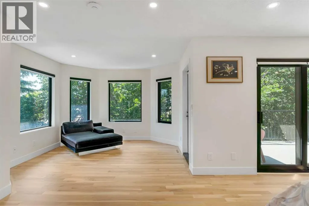 white oak hardwood, and expansive black-trimmed triple-pane windows that flood the space with natural light and frame peaceful views of the treed landscape beyond. The soaring open to above living room is anchored by a dramatic feature wall with a sleek fireplace, while the adjacent front-facing family room complete with its own fireplace and soaring ceiling offers versatility as a formal dining space or lounge. At the heart of the home, the gourmet kitchen is a true chef’s haven, showcasing a quartz waterfall island, full-slab backsplash, designer cabinetry, custom hood fan, and premium integrated appliances including a 6-burner gas cooktop, Thermador fridge, Miele dishwasher, built-in oven, steam cooker, and warming drawer. A sunny breakfast nook with built-in seating opens to the covered deck, ideal for al fresco dining while overlooking the yard and park beyond. A stylish powder room and a spacious mudroom with built-in laundry and a convenient dog wash complete the main level. Ascend the elegant curved staircase to discover a swoon-worthy primary retreat that impresses with its grand proportions, serene sitting area, and private balcony overlooking the treetops. The spa-inspired ensuite features dual sinks, heated floors, and an oversized steam shower, while the large walk-in closet completes the experience. Three additional bedrooms are thoughtfully positioned on the opposite side of this level, alongside a stylish 5-piece bathroom with dual sinks to keep busy mornings stress-free. The basement is an entertainer’s dream, complete with a full wet bar with beverage fridge, a mood-lit rec room perfect for movie nights and social gatherings, two additional bedrooms, a 3-piece bathroom, and a rejuvenating sauna. Outside, the south-facing backyard is a private sanctuary with two patio areas, grassy play space, and a unique enclosed shed with skylight perfect for gardening or creative use. Extensive upgrades include hardwired motorized blinds, custom millwork, updated plumbing and electrical, new roof, exterior foam insulation and stucco, driveway extension, EV charger, heated garage with epoxy floors, water filtration system, motorized deck screens, Gemstone lighting, and more. Located just steps from Fish Creek Park, community ponds, and walking trails, this extraordinary home is an unparalleled blend of thoughtful design, luxurious comfort, and timeless appeal. (id:62650)