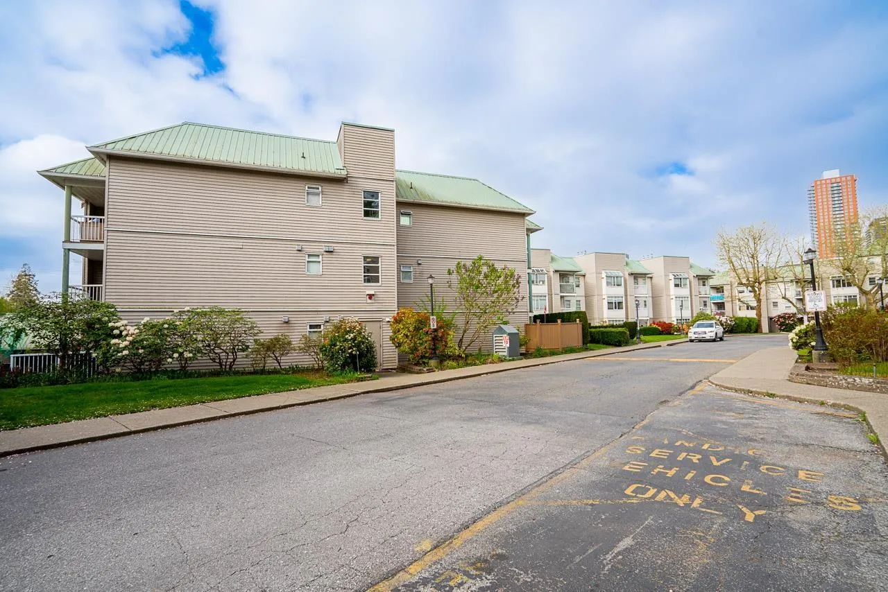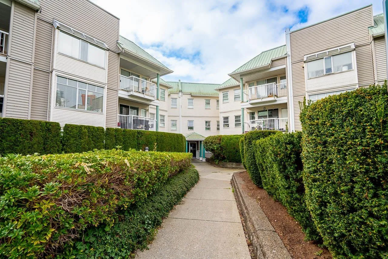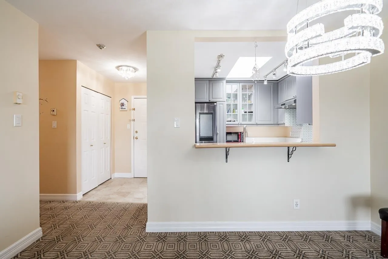 This bright, south facing top floor 2 bed, 2 bath condo at FRASER GATE offers a spacious layout. The kitchen features shaker style cabinets, black and stainless appliances, quartz like counter tops, skylight and a pass through to the dining area. An efficient gas fireplace warms the cozy living room which boasts oversized windows and balcony access. The primary bedroom