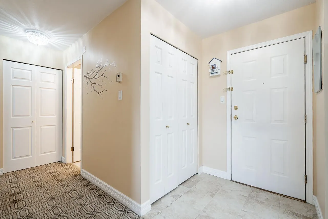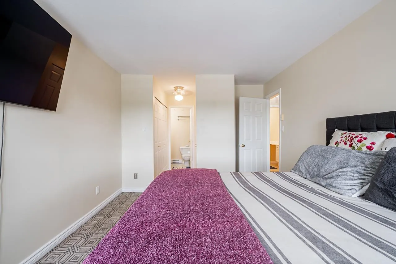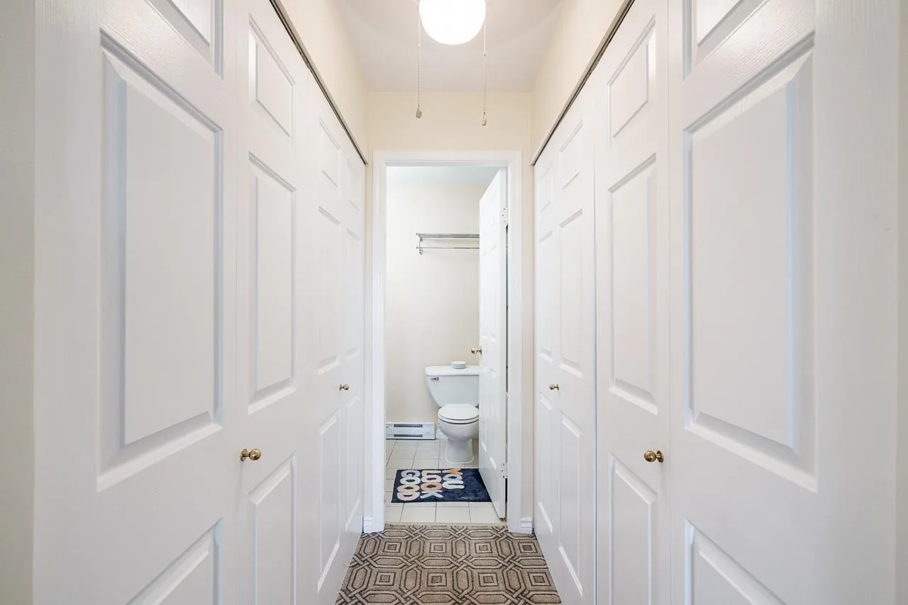 This bright, south facing top floor 2 bed, 2 bath condo at FRASER GATE offers a spacious layout. The kitchen features shaker style cabinets, black and stainless appliances, quartz like counter tops, skylight and a pass through to the dining area. An efficient gas fireplace warms the cozy living room which boasts oversized windows and balcony access. The primary bedroom
