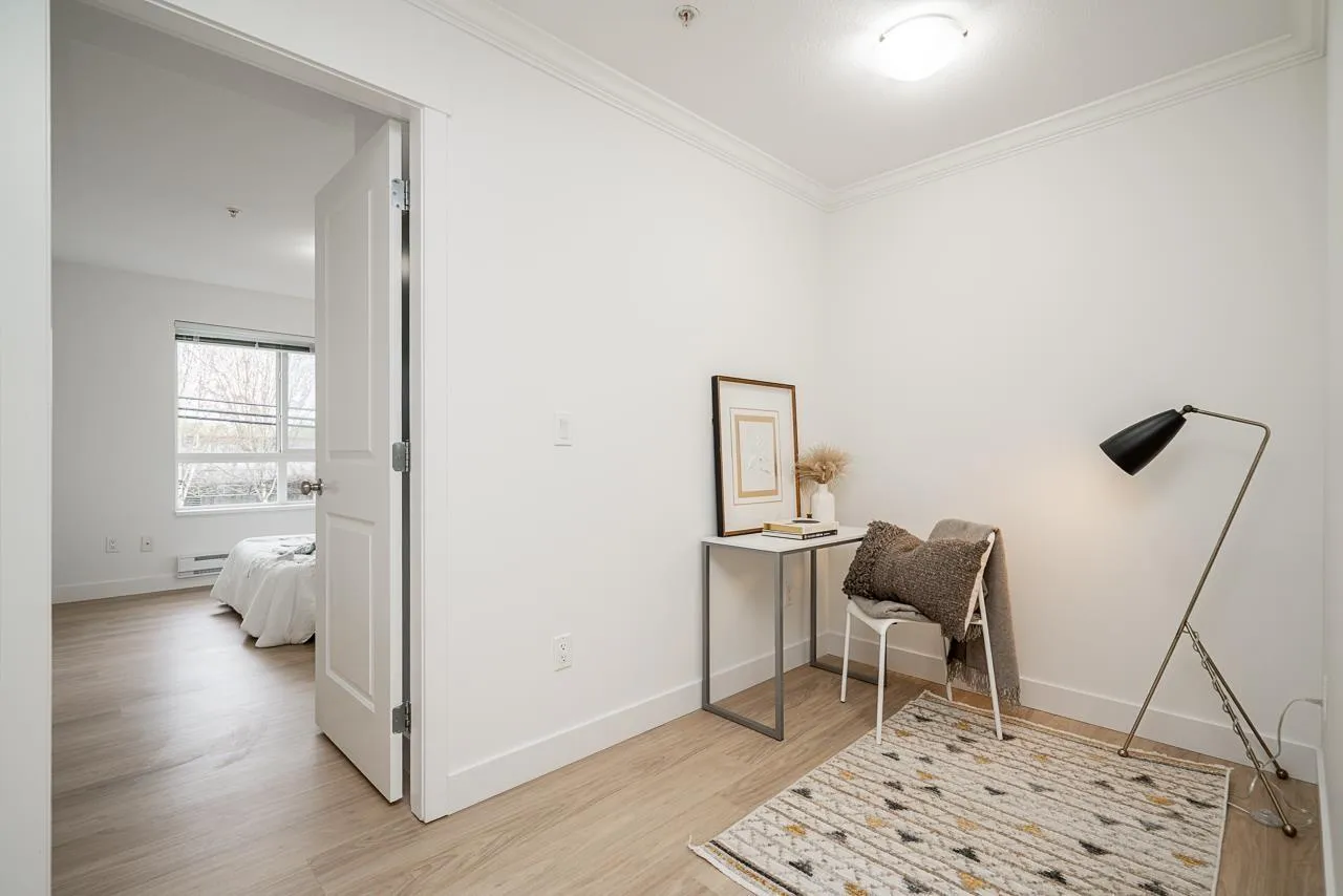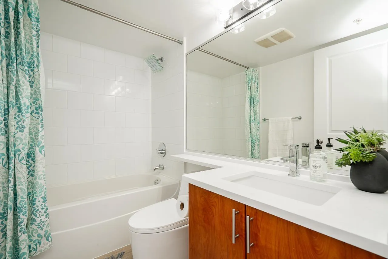Newly renovated and spacious 1,156 sq. ft. bright corner home at The Max in the heart of Guildford. This 2 bed + den residence features an open great room with over-height ceilings, oversized windows, and an efficient layout with minimal wasted space. The split-bedroom design offers excellent privacy, with the primary suite and second bedroom on opposite sides. The gourmet