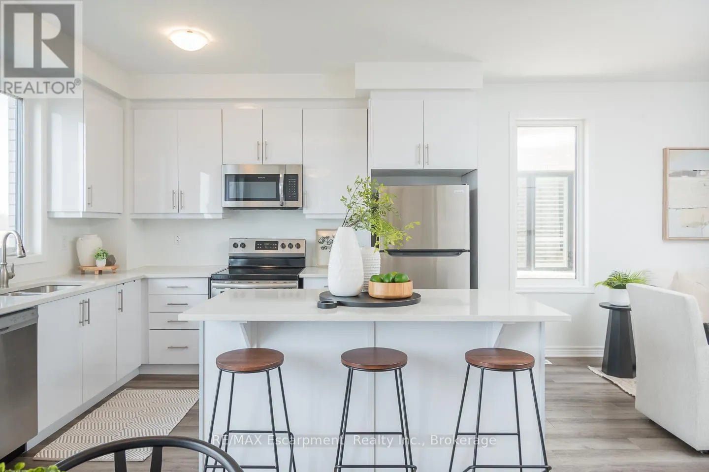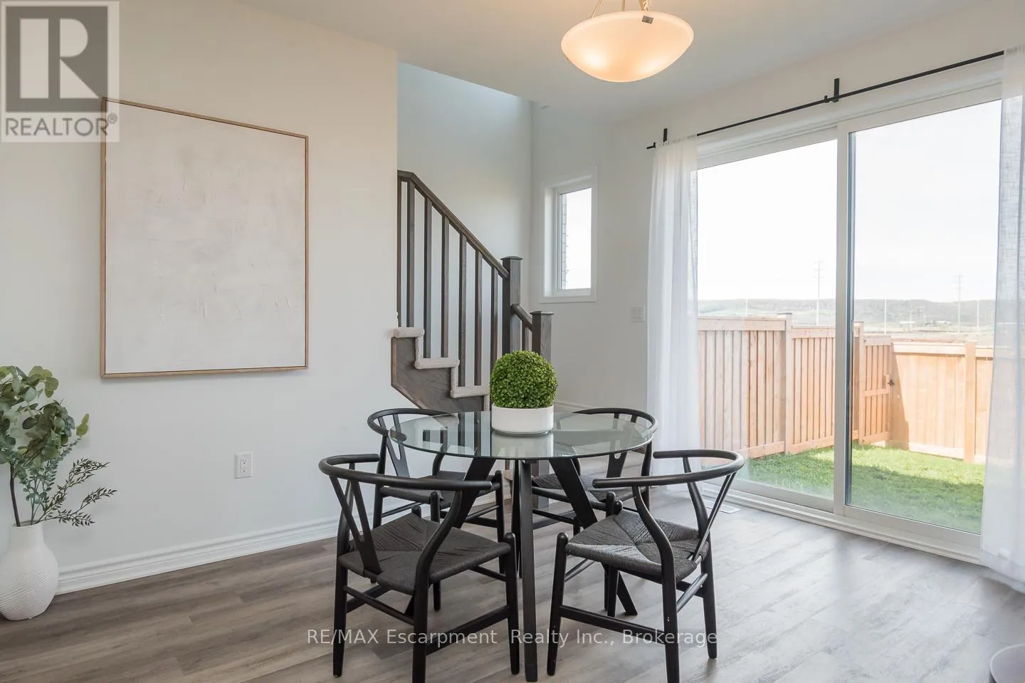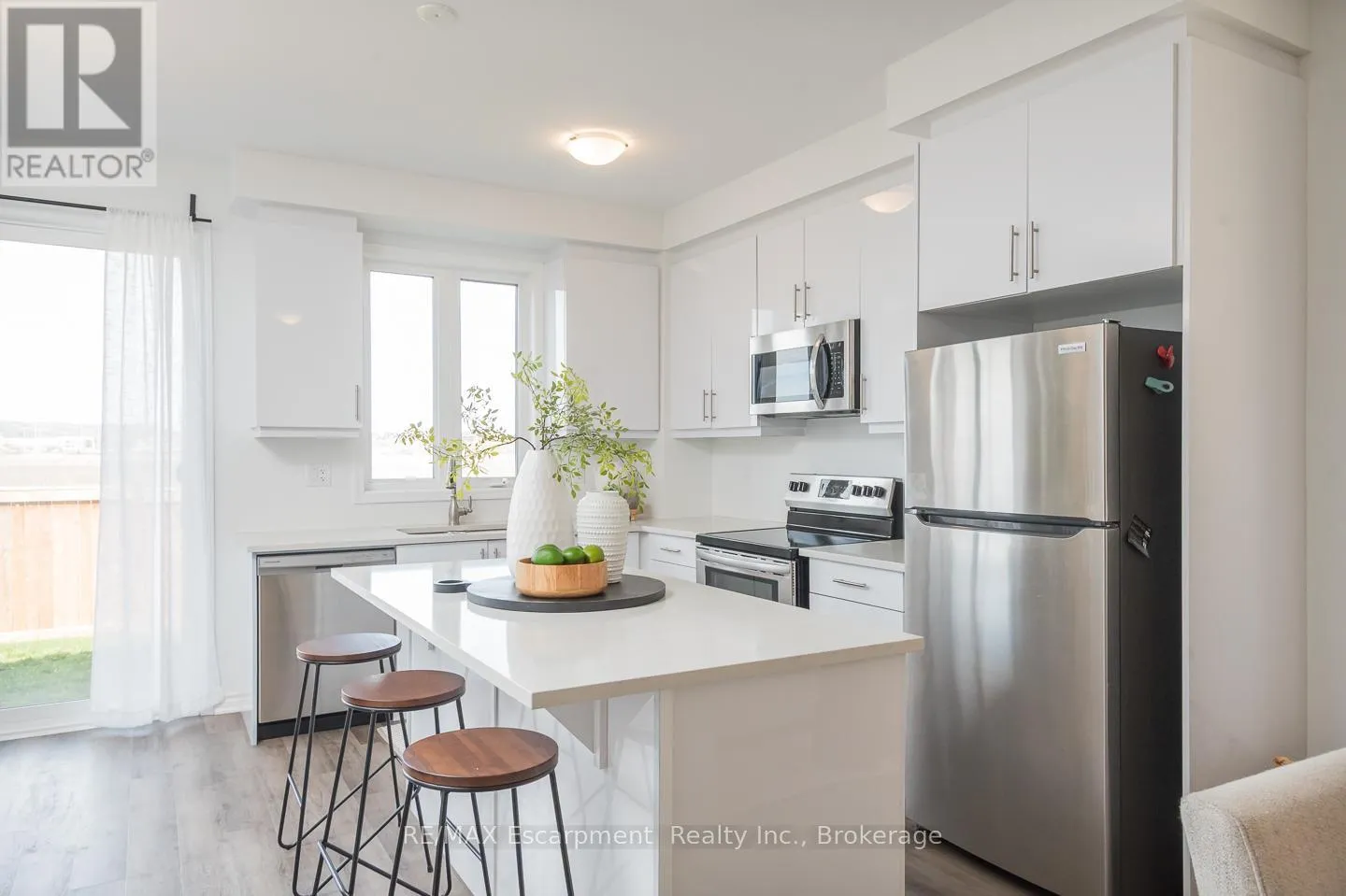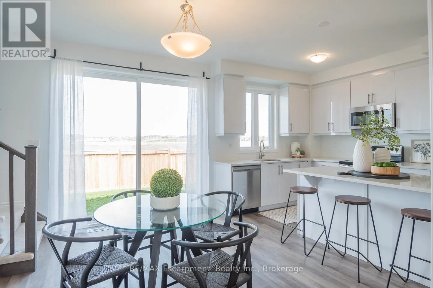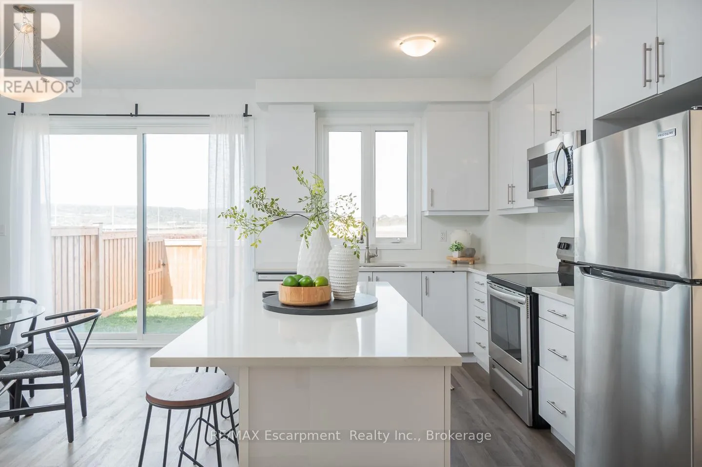 Spacious 4 bedroom end-unit townhome with a thoughtful layout, 9 ft ceilings, and escarpment views. The main floor features a bright kitchen with white cabinetry, quartz countertops, stainless steel appliances, and a centre island with breakfast bar seating. Double sliding doors lead to a fully fenced backyard, making indoor-outdoor living easy, while main floor laundry and interior garage access add