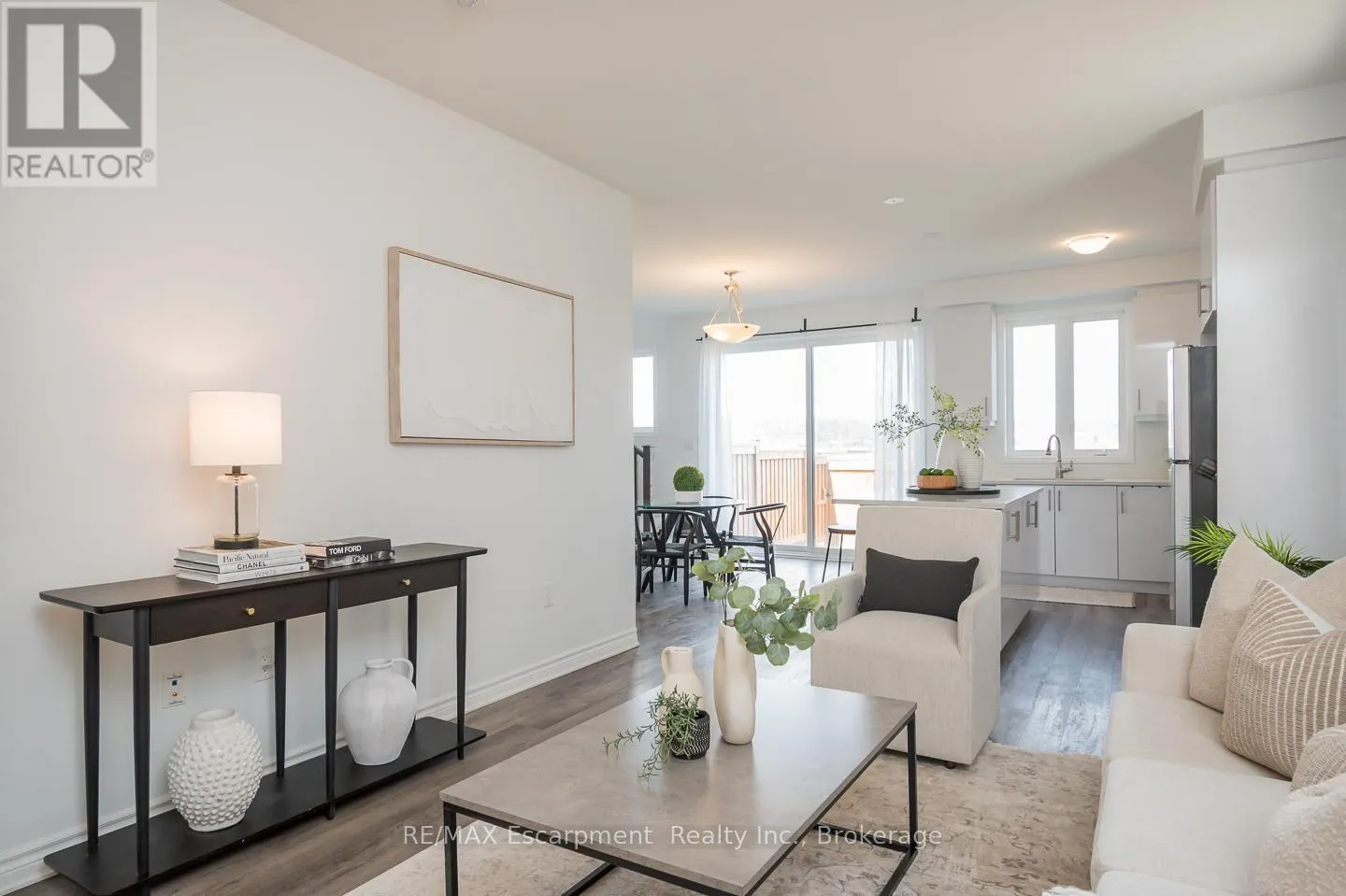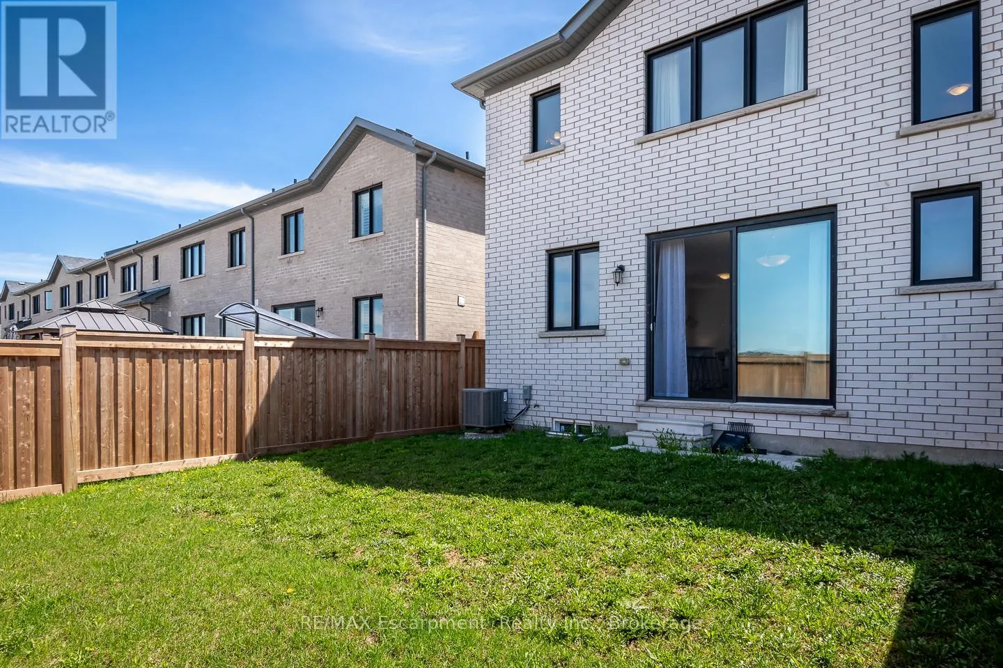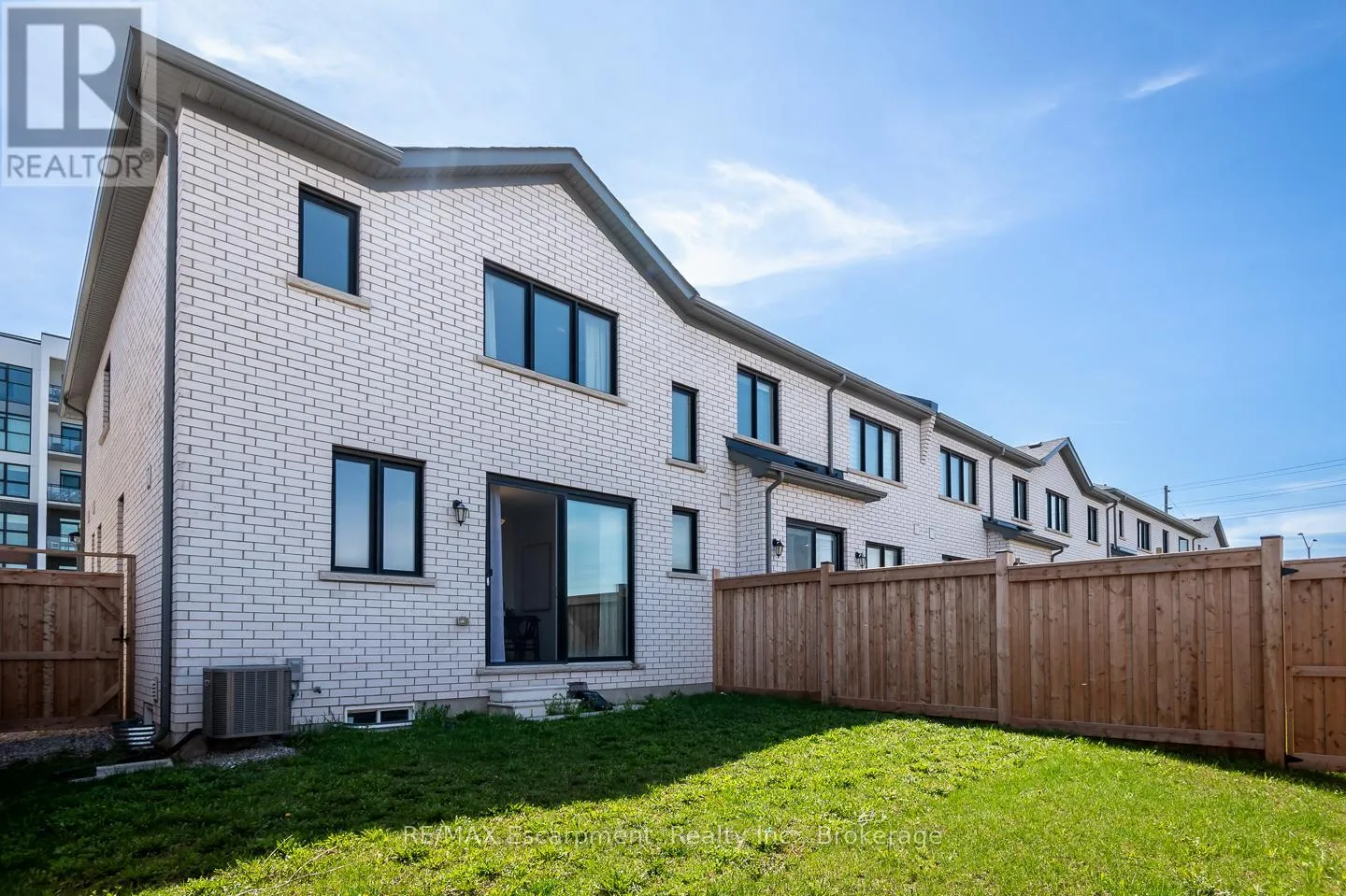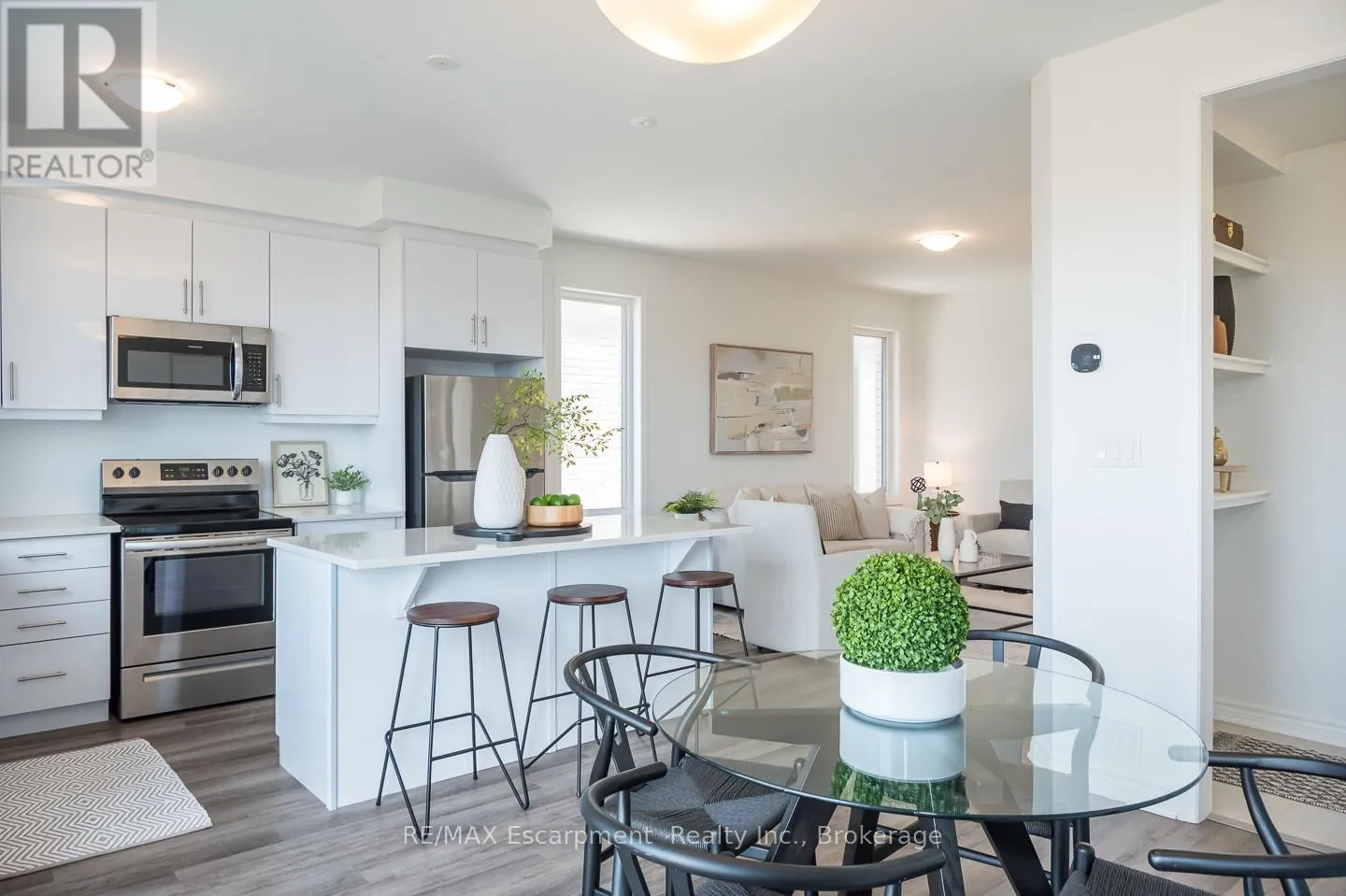 Spacious 4 bedroom end-unit townhome with a thoughtful layout, 9 ft ceilings, and escarpment views. The main floor features a bright kitchen with white cabinetry, quartz countertops, stainless steel appliances, and a centre island with breakfast bar seating. Double sliding doors lead to a fully fenced backyard, making indoor-outdoor living easy, while main floor laundry and interior garage access add