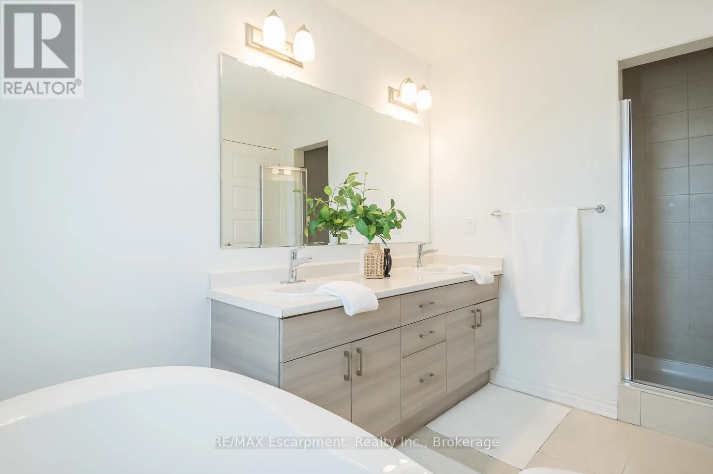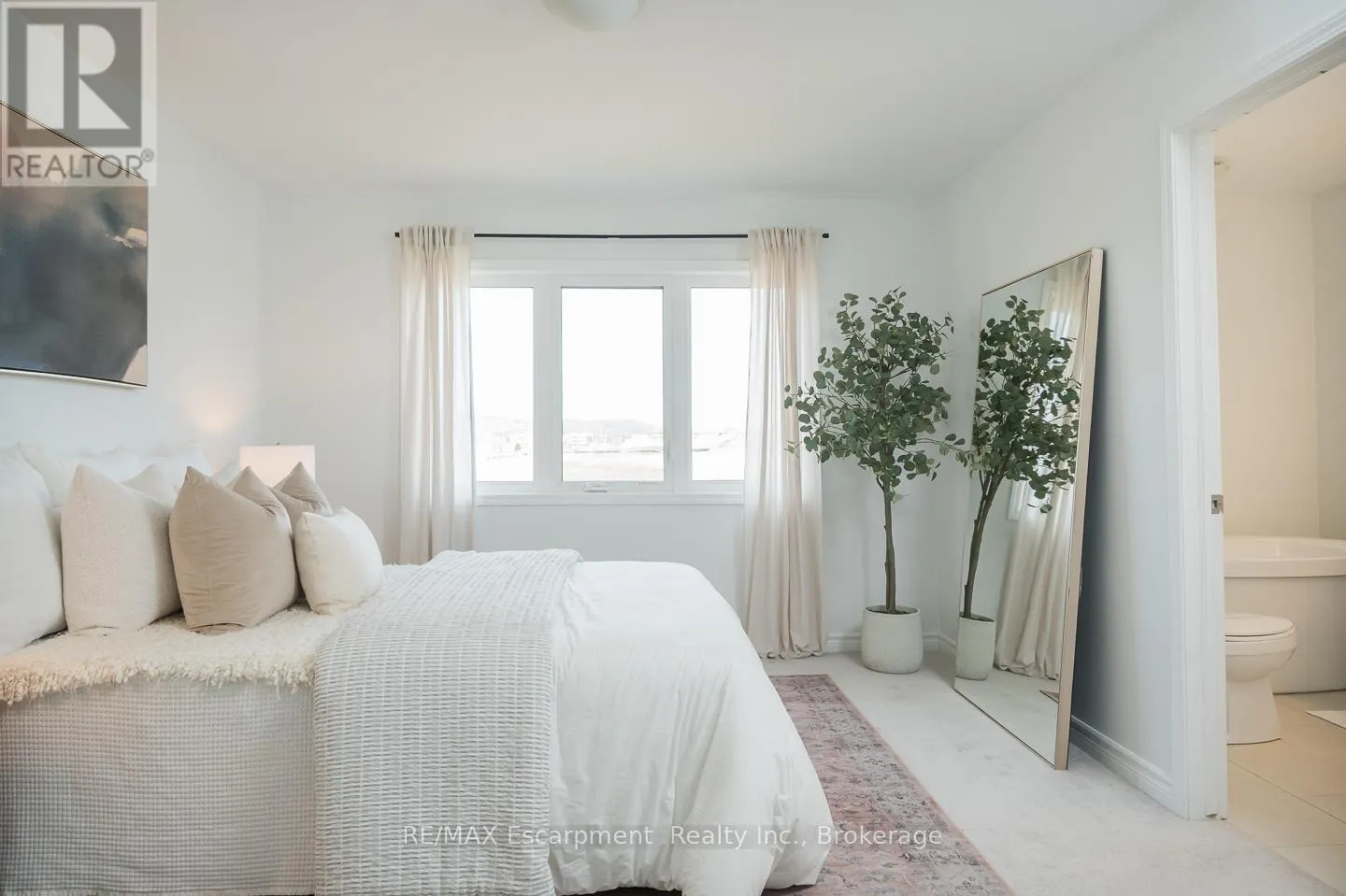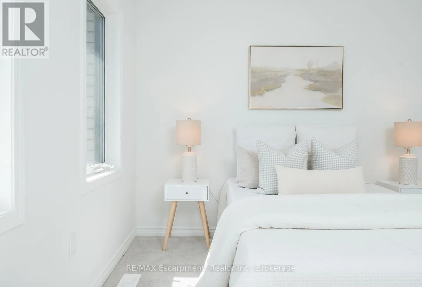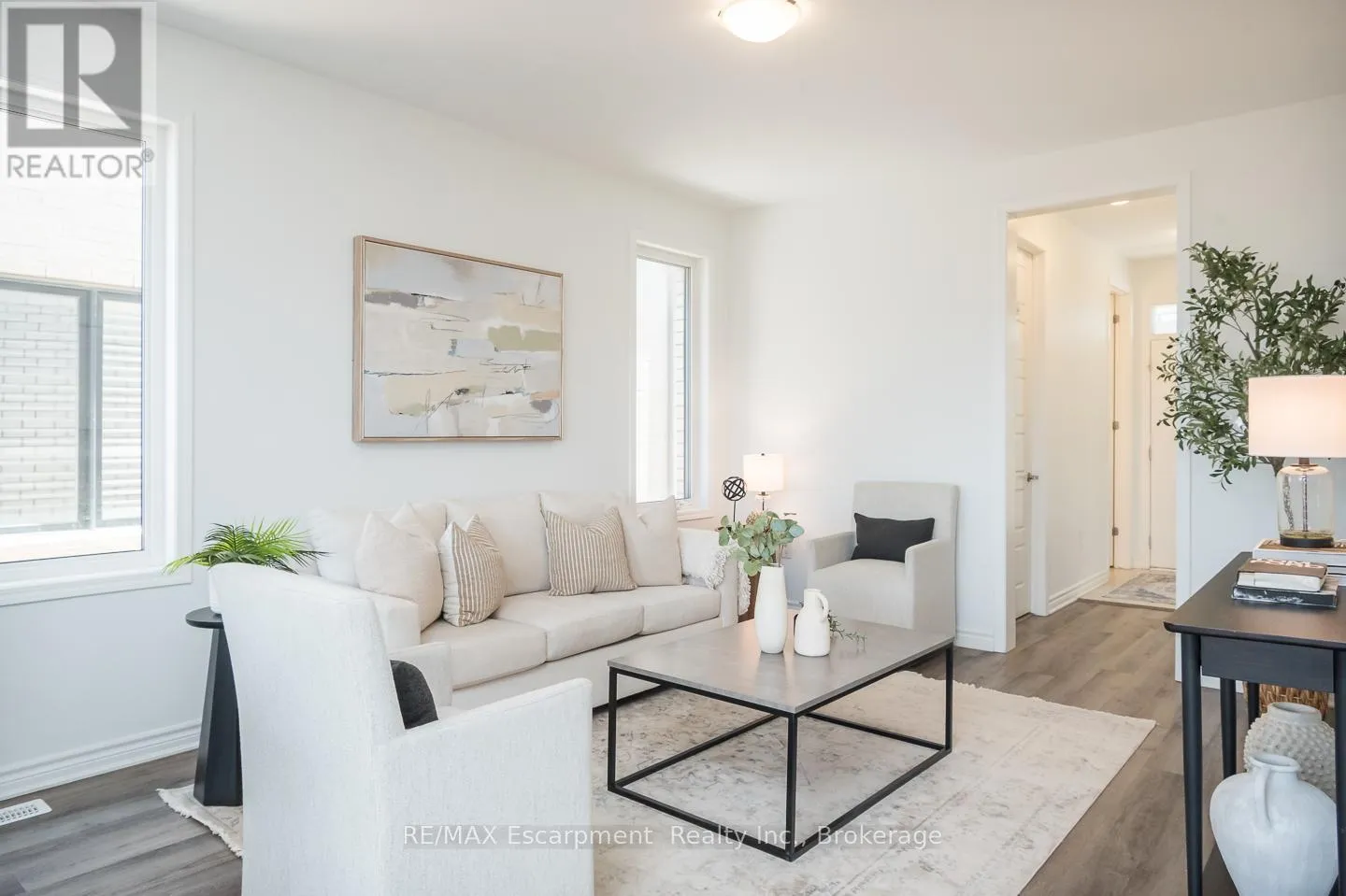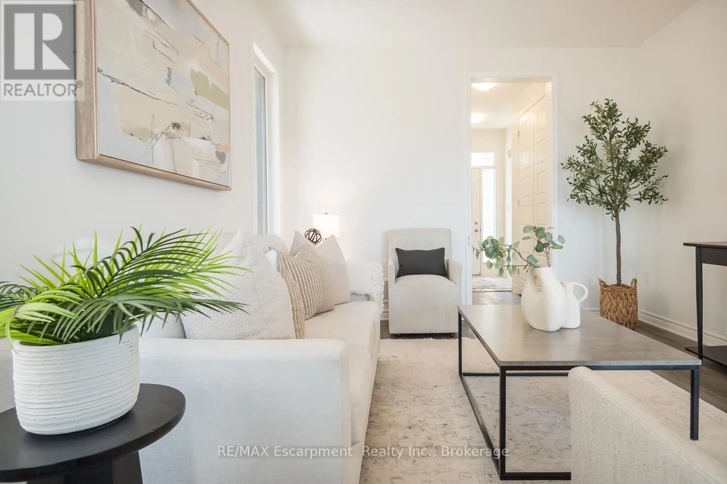 Spacious 4 bedroom end-unit townhome with a thoughtful layout, 9 ft ceilings, and escarpment views. The main floor features a bright kitchen with white cabinetry, quartz countertops, stainless steel appliances, and a centre island with breakfast bar seating. Double sliding doors lead to a fully fenced backyard, making indoor-outdoor living easy, while main floor laundry and interior garage access add