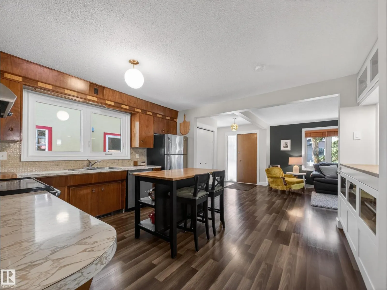 Updated bungalow in Parkdale in central Edmonton on a quiet tree lined street close to downtown, schools, parks and transit. This 3 bedroom 2 bathroom home offers an open main floor with great natural light, built in hutch added in 2018 and solid wood kitchen cabinets. Key upgrades include vinyl windows, roof 2020, main bath 2020, updated electrical, dishwasher 2022