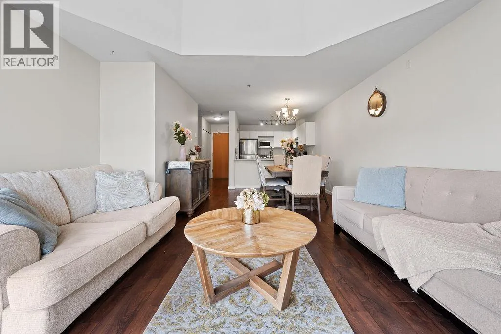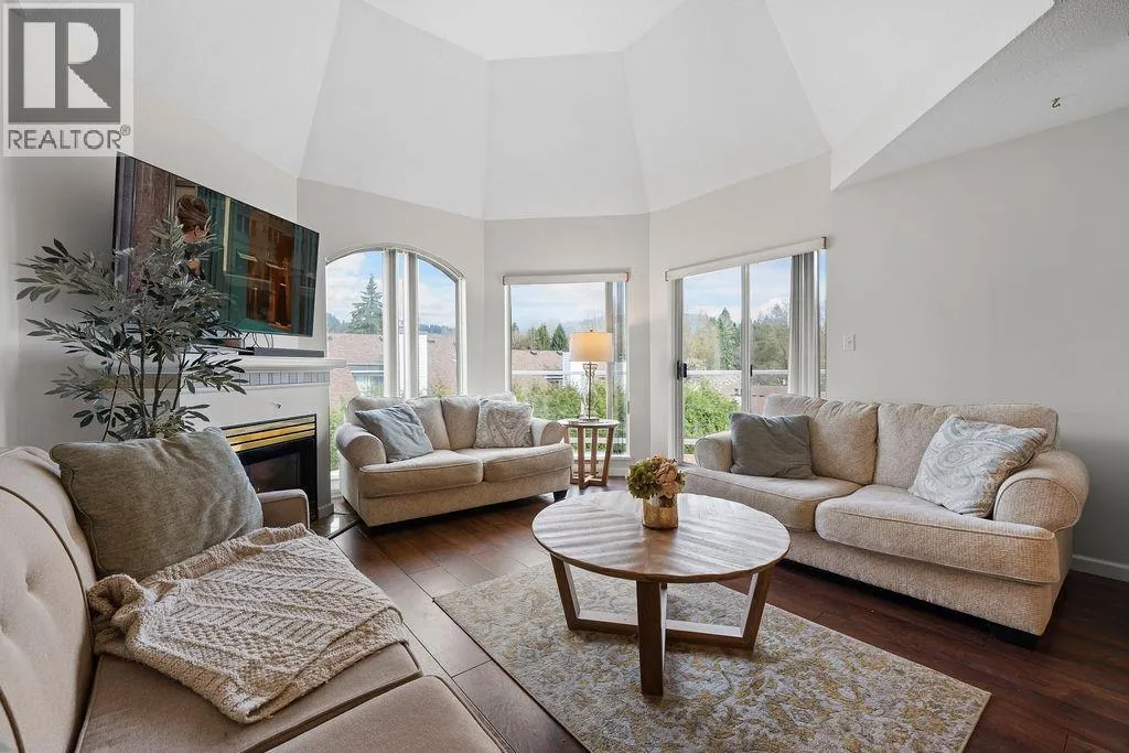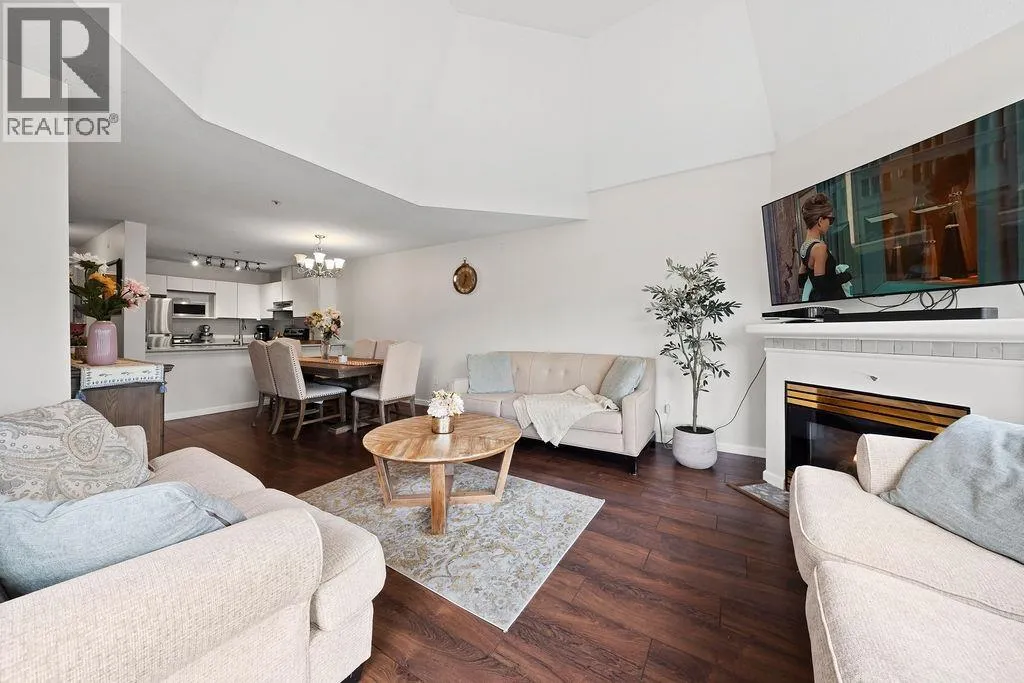 Welcome to your bright top-floor 2 bedroom, 2 bathroom condo with mountain views and soaring vaulted ceilings that create an airy, uplifting feel! Beautiful engineered hardwood floors flow throughout, paired with a modern kitchen featuring sleek stainless steel appliances. The open floor plan connects living, dining, and kitchen areas around a cozy gas fireplace, with a spacious balcony accessible from